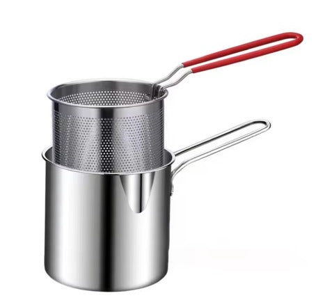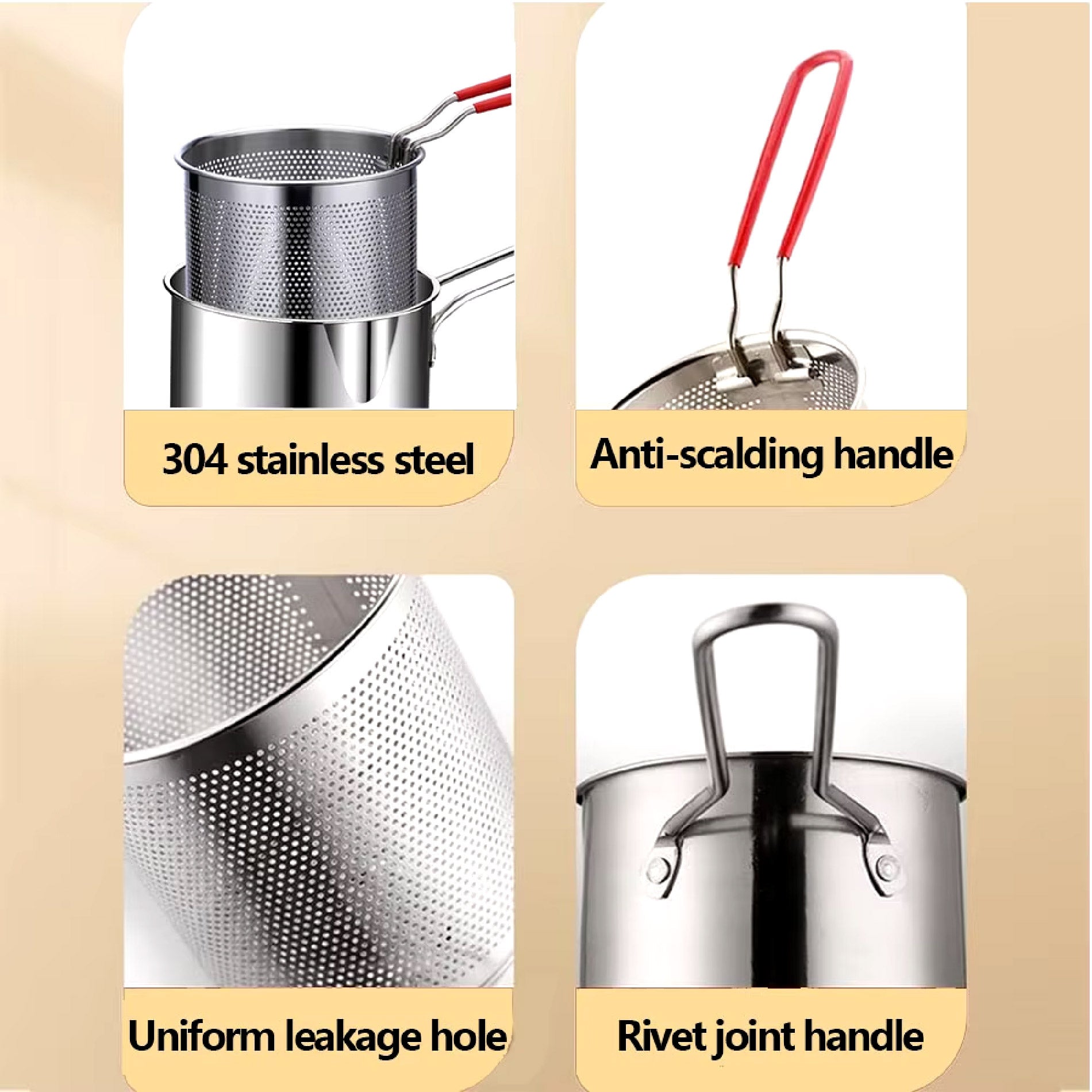 Fabricada en acero inoxidable de alta calidad (304), esta freidora es resistente a la corrosión y al uso intensivo. Es fácil de limpiar gracias a su diseño desmontable y compacta para guardar. Además, cuenta con marcas internas de nivel de aceite que te ayudan a cocinar sin desperdiciar.
